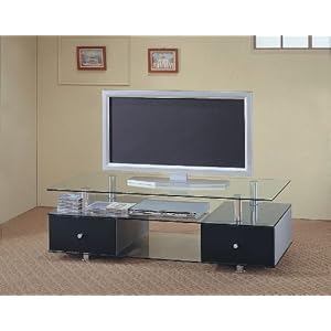 Dimension: 57"L 20"D 19.25"H Finish: Black and Silver Material: Metal, Wood and Glass Contemporary Glass Shelves Flat Panel TV Stand with Drawers Item features glass bottom and base. Two pull out storage drawers. Item is designed to be practical in use and to beautify your home decor. Simple Assembly Required.